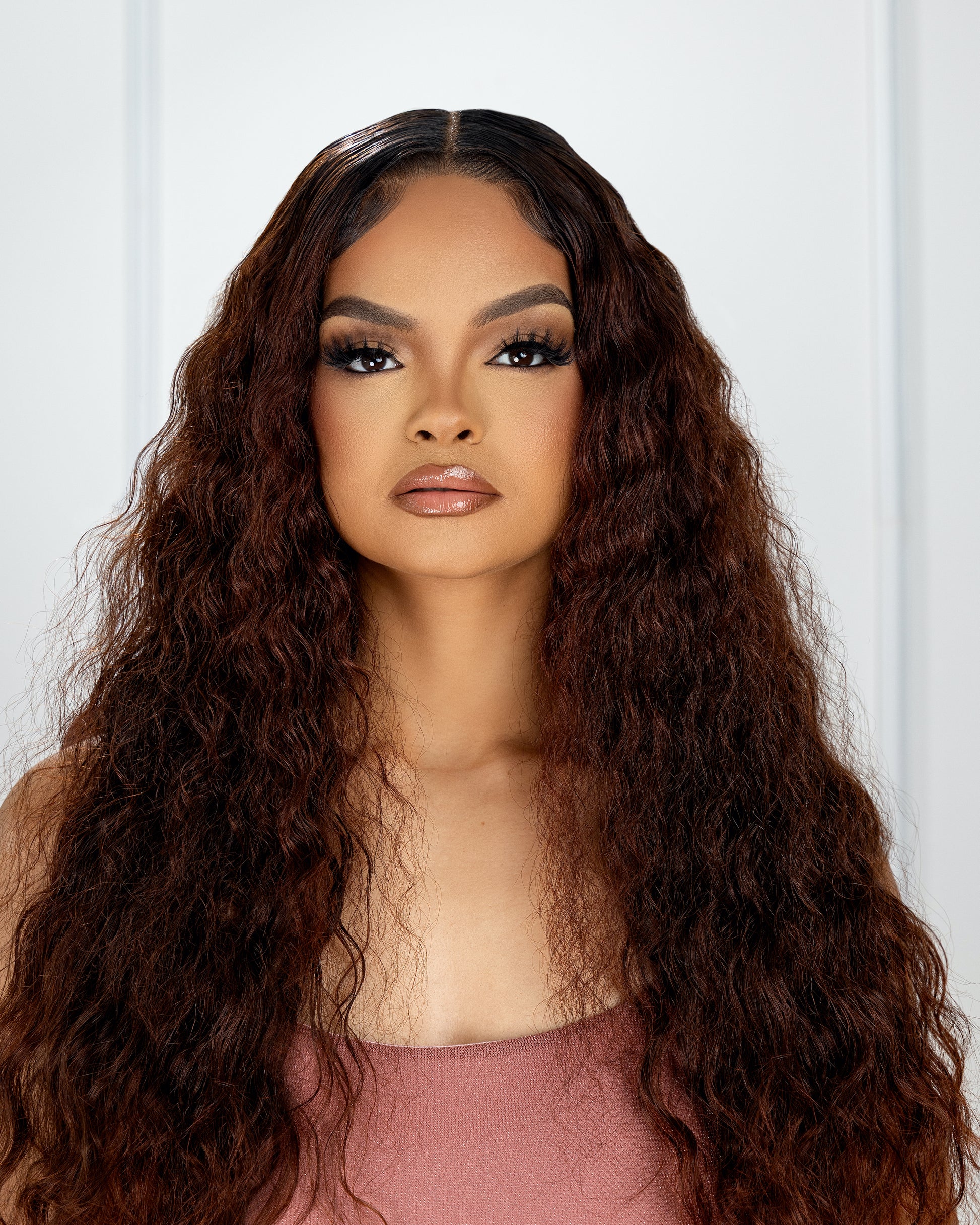 Carmen in Copper is a 24-inch glueless unit that’s perfect for achieving effortless beach waves or defined curls. With a sleek middle part and deep curly texture, this wig delivers that "just-stepped-off-the-beach" look that’s both glamorous and relaxed. Whether styled dry for volume or wet for gorgeous definition, Carmen's copper curls are always ready to impress.